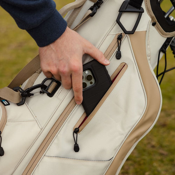 The Golf Bag features unique storage options, including an Insulated Frosty Pocket that chills up to four cans, perfect for keeping drinks cool on sunny days. It also has a Smell Proof Pocket for discreetly storing personal items, maintaining their freshness. Moreover, the bag is fitted with high-tech, water-resistant zippers, offering essential protection in varied weather, ensuring your gear remains dry and safe. These aspects together boost the bag’s practicality, making your golf rounds more enjoyable.